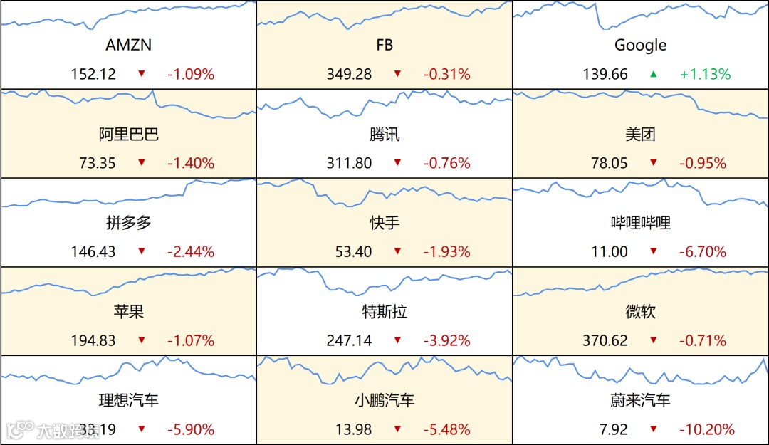 美国三大股指全线收跌,道指跌1.27%报37082点,标普500指数跌1.47%报4698.35点,纳指跌1.5%报14777.94点。热门中概股普遍下跌,高途集团跌12.41%,硕迪生物跌11.39%,哔哩哔哩跌6.7%,中概新能源汽车股全线下跌,蔚来汽车跌10.2%,小鹏汽车跌5.44%,理想汽车跌5.9%。