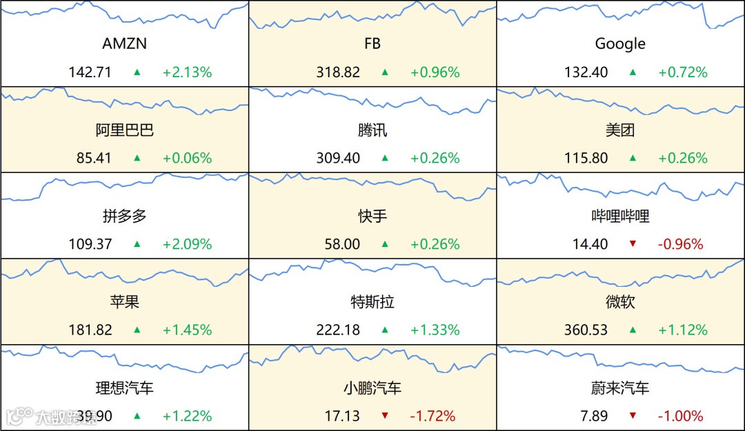 涨2.13%,特斯拉涨1.33%。中概股多数下跌,新濠博亚娱乐跌15.38%,亿航智能跌12.7%。