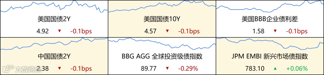 美债收益率全线走低,2年期美债收益率跌2.1个基点报4.926%,3年期美债收益率跌4.2个基点报4.694%,5年期美债收益率跌5.5个基点报4.543%,10年期美债收益率跌7.8个基点报4.574%,30年期美债收益率跌8.4个基点报4.73%。