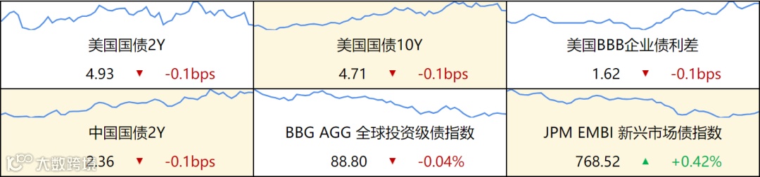 ▷ 美国债券:美债收益率全线收跌,2年期美债收益率跌14.2个基点报4.954%,3年期美债收益率跌17个基点报4.759%,5年期美债收益率跌19.6个基点报4.66%,10年期美债收益率跌19.4个基点报4.739%,30年期美债收益率跌16.1个基点报4.932%。