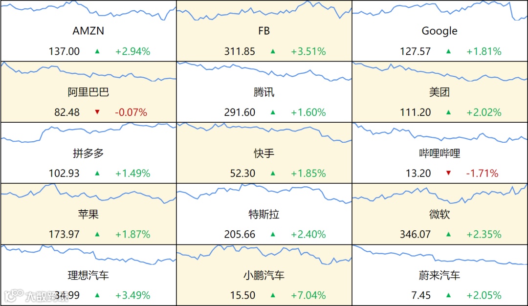 ▷ 美国股票:美国三大股指全线收涨,道指涨0.67%报33274.58点,标普500指数涨1.05%报4237.86点,纳指涨1.64%报13061.47点。卡特彼勒涨2.56%,微软涨2.35%,领涨道指英伟达涨3.79%,特斯拉涨2.4%。中概股涨跌不一,金生游乐涨10.7%,百胜中国跌15.2%。