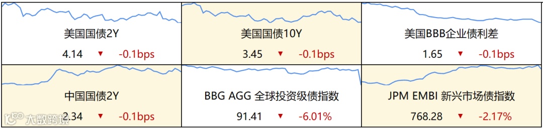 ▷ 美国债券:美债收益率集体下跌,2年期美债收益率跌6.7个基点报4.159%,10年期美债收益率跌9.6个基点报3.45%。