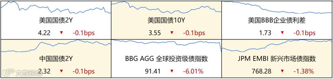 ▷ 发达国家债券:欧债收益率多数上涨,英国10年期国债收益率涨5.4个基点报3.520%,法国10年期国债收益率涨1.2个基点报2.726%,德国10年期国债收益率涨2个基点报2.224%,意大利10年期国债收益率跌2.7个基点报4.172%,西班牙10年期国债收益率涨0.7个基点报3.262%。
