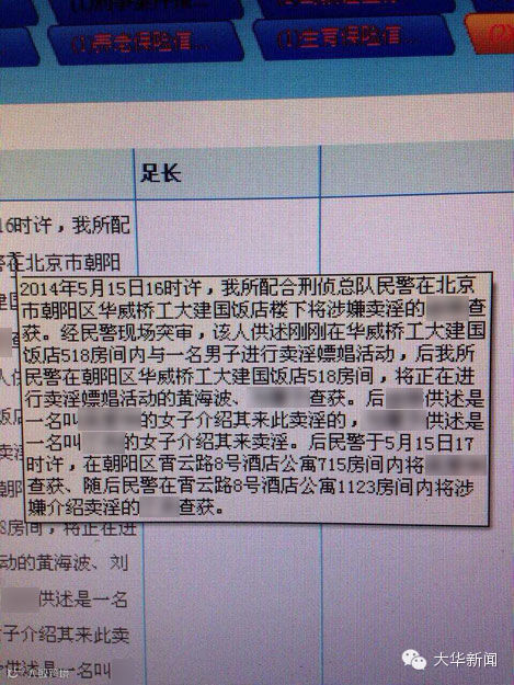 细节文字称:在“2014年5月15日16时许,我所配合刑侦总队民警在北京市朝阳区华威桥工大建国饭店楼下将涉嫌卖淫的由某查获。经民警现场突审,该人供述刚刚在华威桥工大建国饭店518号房间内与一名男子进行卖淫嫖娼活动。后我所民警在朝阳区华威桥工大建国饭店518号房间,将正在进行卖淫嫖娼的黄海波、刘某某查获。据由某供述称,她是由女子吴某某介绍来卖淫的,而刘某某供述是女子丁某介绍其来卖淫。民警于5月15日17时许,在朝阳区霄云路8号酒店公寓715房间将吴某某抓获,在霄云路8号公寓1123房间内将涉嫌介绍卖淫的丁某查获。”但此细节并未得到警方证实。