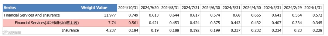 11月, 核心PCE同比增加2.8%,整体符合预期,比上期同比稍微加速,这其中PCE服务业同比增长3.8%,是本次PCE同比增速超过前值的主因,但从分项上可以看到,医疗保健、住房等主要项目同比仍在降速,本次主要的增速部分源自金融服务和保险,但可以从下表看到保险的同比增速小幅度下降,金融服务加权后同比增速比前值高0.14,几乎是本次服务业同比增速上升的全部部分,鉴于金融服务通胀几乎没有传导性且黏性也较差,因此PCE数据上看和CPI以及PPI情况相同,通胀仍是下降趋势。