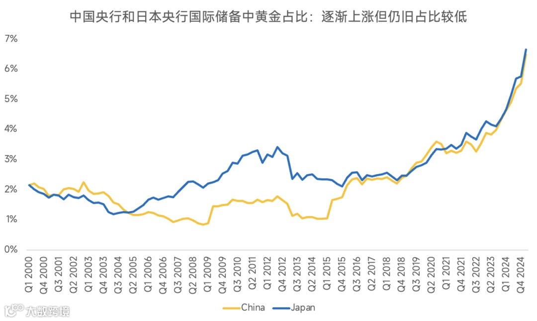 如果我们具体来看几个有代表性的国家,首先,中国央行和日本央行一样,仅公开披露其外汇储备和黄金等类别的占比,并不会公开披露具体货币的占比。对于中国和日本来说,美元一直是其外汇储备中相对占据主导地位的货币,而黄金则一直是国际储备中相对占比较少的资产。自2000年至2024年,中国和日本国际储备中的黄金占比都从2%左右上涨至目前的6-7%,虽然涨幅不大,但趋势上呼应了全球国际储备的整体黄金占比趋势变化(见下图)。