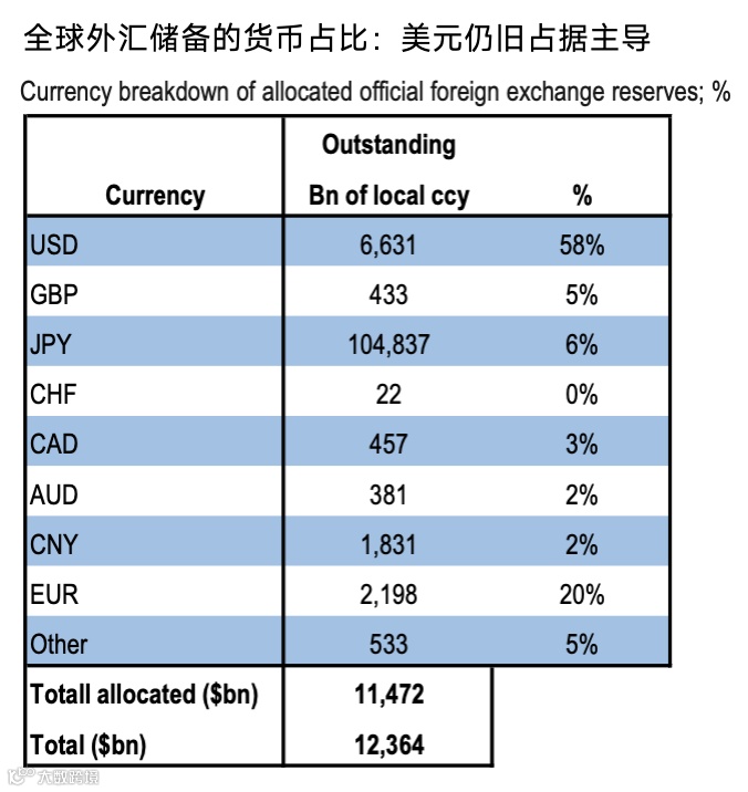 根据国际货币基金组织披露的最新数据,全球当前总外汇储备规模为12.3万亿美元,而各国披露了详细币种构成数据的有11.4万亿美元。在这11.4万亿美元的规模中不同货币占比如下图所示:美元仍旧占据主导地位(58%),其次是欧元(20%),而其余货币都仅有较低的个位数占比。