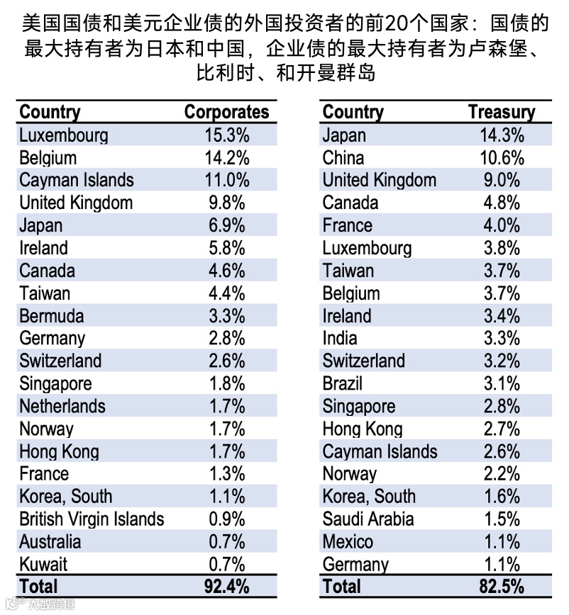 虽然看似占比相同,但国债和企业债的外国投资者构成却大相径庭:由外国投资者持有的美国国债中,有43.5%为外国官方机构持有、56.5%为外国私人投资者持有;而由外国投资者持有的美元企业债中,则仅有5.1%为外国官方机构持有、剩余94.9%都为外国私人投资者持有。