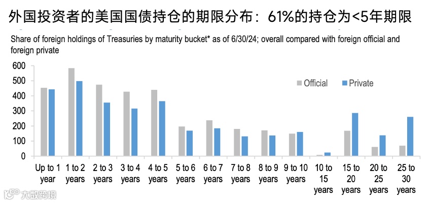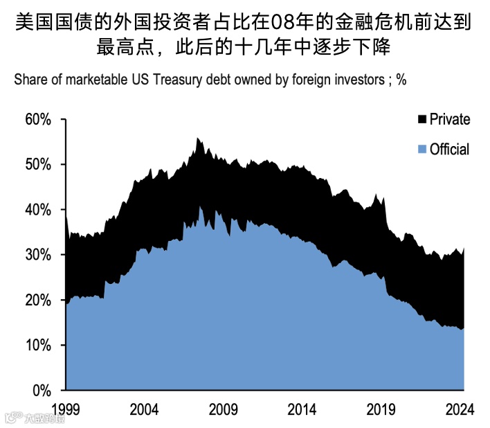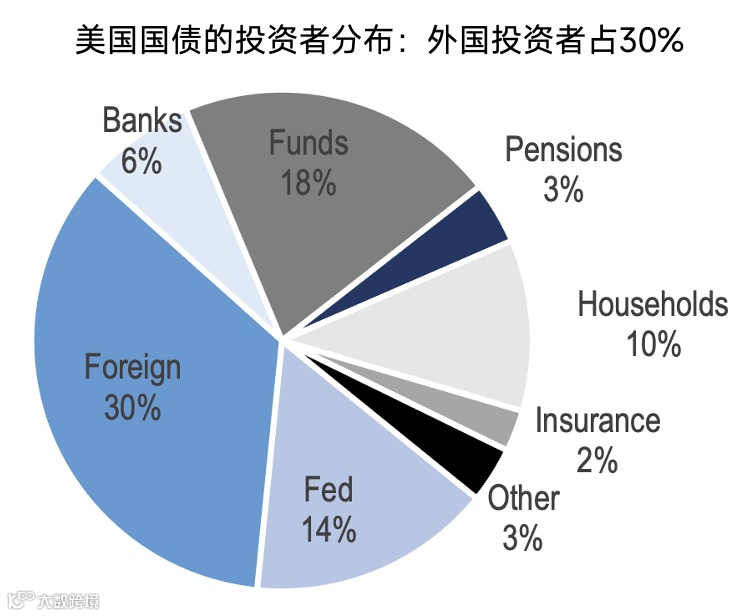 在美国国债市场中,外国投资者占比为30%(见下图)。