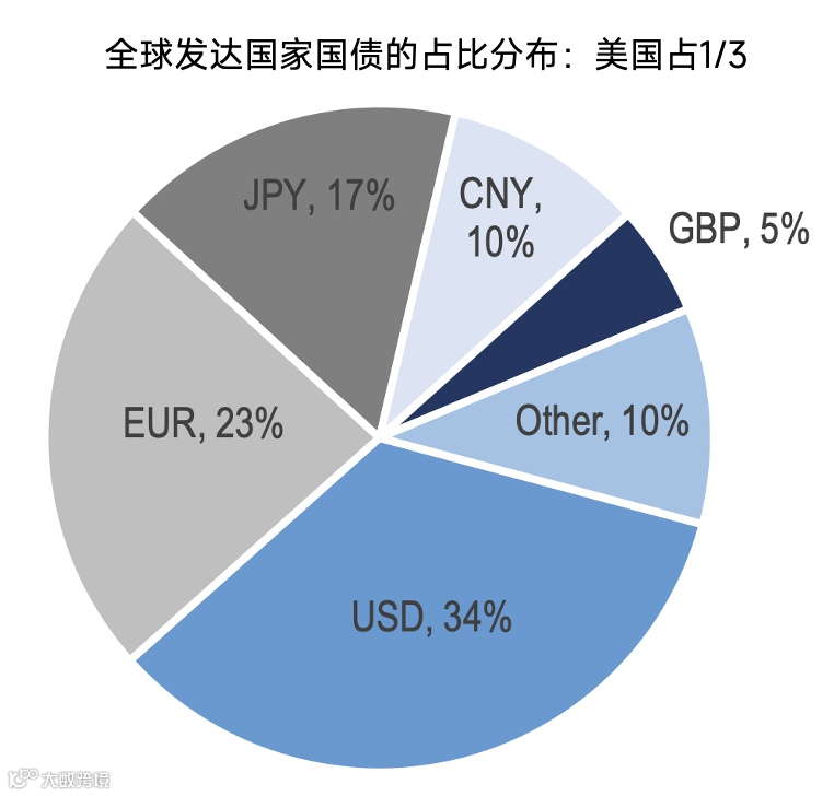 以美元债券为例,全世界发达国家的国债市场中美国国债的占比为34%(见下图)。虽然排名第二的欧元区主权国债占比23%,但由于这包含了欧洲各国的国债且各国状况差异较大,因此从流动性角度考虑,很难认为欧洲国债已经能够替代美国国债。