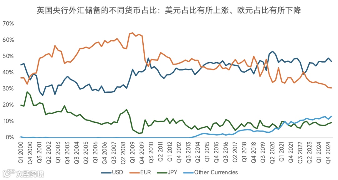 不同于中国和日本央行,英国央行会月度披露其外汇储备的具体货币占比。对于英国来说,美元虽然是其外汇储备中重要的一部分,但并不是唯一占据主导地位的货币。自2000年至2024年,英国外汇储备的美元占比在26-53%的区间波动,目前占比47%;欧元占比则一度上涨到64%后又降至目前的31%(见下图)。国际储备中,特别提款权(SDR)目前占比21%;而黄金则目前占比16%。