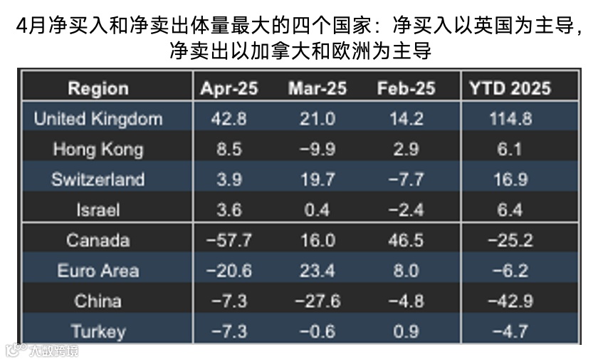从地域角度看,净卖出压力主要来自加拿大,投资者在4月份抛售了577亿美元的长期美国国债,创下历史新高。欧洲投资者在4月份也是净卖出,其中266亿美元的净卖出来自比利时、荷兰、和卢森堡三国。这些相对较小的国家作为全球资金中心,其需求可能反映了其他外国机构在托管账户中的交易。中国4月仅卖出73亿长期美国国债,相对温和。日本投资者在4月份净卖出29亿美元的长期美国国债,略低于历史上4月的平均水平,表明没有显著迹象来佐证日本投资者正在大幅从美国国债中撤离。与此同时,英国的投资者在4月份是最大的净买家,增持了428亿美元的长期美国国债,但鉴于其作为全球金融中心的特性,难以确定买入需求的原始来源。