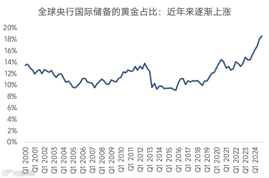 除去不同货币以外,全球央行总国际储备中往往也包含黄金。从2000年到2024年,黄金占比从13%一度降至9%后又上涨到目前的19%(见下图)。这一上涨趋势在过去的三年中尤为明显,自2022年第一季度俄乌战争爆发、美国冻结俄罗斯央行的美元资产后,黄金占比在三年内已经上涨了5%,也呼应了“去美元化”这个概念成为世界热点话题的时间点。