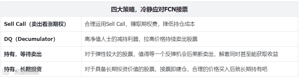最大风险在于接票:因此最关键的还是对挂钩股票(公司)本身有深入研究和判断。FCN只是一个工具、产品或表现形式,核心问题始终是股票的质量与投资逻辑。在开始做FCN时,务必要清楚认识这一点。避免因短期的高报价吸引而投机,也不要因为某只股票近期大幅下跌就盲目认为不会再跌,而没有深入研究便贸然介入。相反,选择FCN标的时不应贪多,应选择那些深度了解、覆盖较好的股票,且即便接票也愿意长期持有的优质公司(尤其是在价格较低时),这是最理想的策略