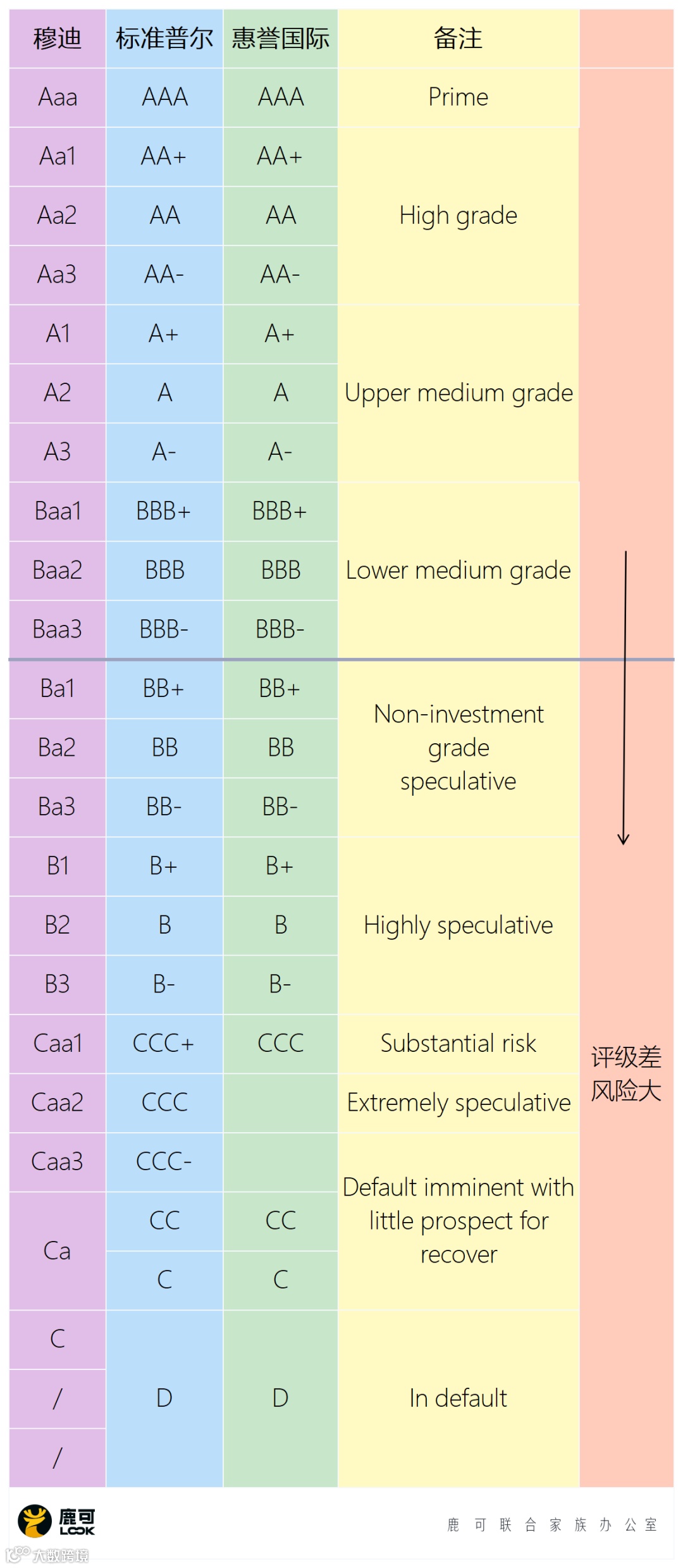 三大评级机构标准不一,但简单来说主要是通过采集的数据和信息通过分析,对一个国家或者一家企业进行风险评估,以及债务偿还能力和未来前景进行展望,并且具有映射对照关系,简单图如下: