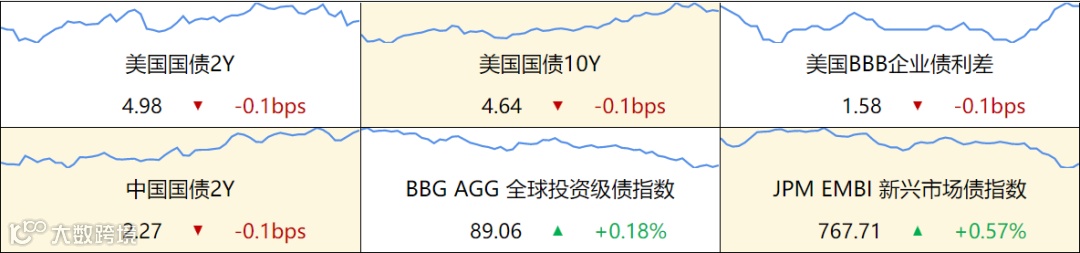 美债收益率全线收跌,2年期美债收益率跌11.4个基点报4.978%,3年期美债收益率跌13个基点报4.764%,5年期美债收益率跌14.6个基点报4.617%,10年期美债收益率跌15个基点报4.656%,30年期美债收益率跌13.8个基点报4.834%。