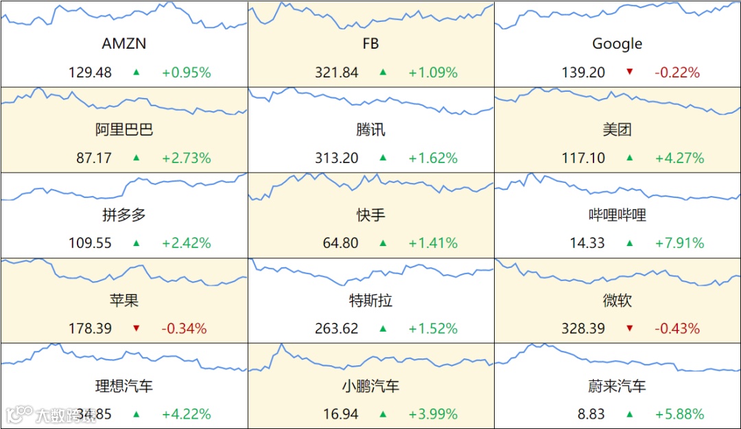 美股三大指数集体上涨,道指涨0.4%,纳指涨0.58%,标普500指数涨0.52%。大型科技股涨跌不一,英伟达、特斯拉、Meta涨超1%,Netflix跌超3%。热门中概股普涨,哔哩哔哩涨近8%,富途控股涨超6%,蔚来涨超5%,爱奇艺、腾讯音乐、满帮、理想汽车涨超4%,小鹏汽车、
