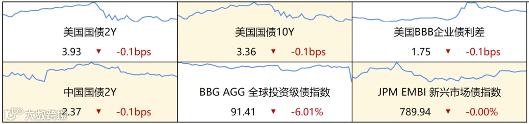 ▷ 发达国家债券:欧债收益率集体收涨,英国10年期国债收益率涨9.2个基点报3.656%,法国10年期国债收益率涨5.7个基点报3.000%,德国10年期国债收益率涨6.5个基点报2.432%,意大利10年期国债收益率涨7.4个基点报4.286%,西班牙10年期国债收益率涨5.9个基点报3.470%。