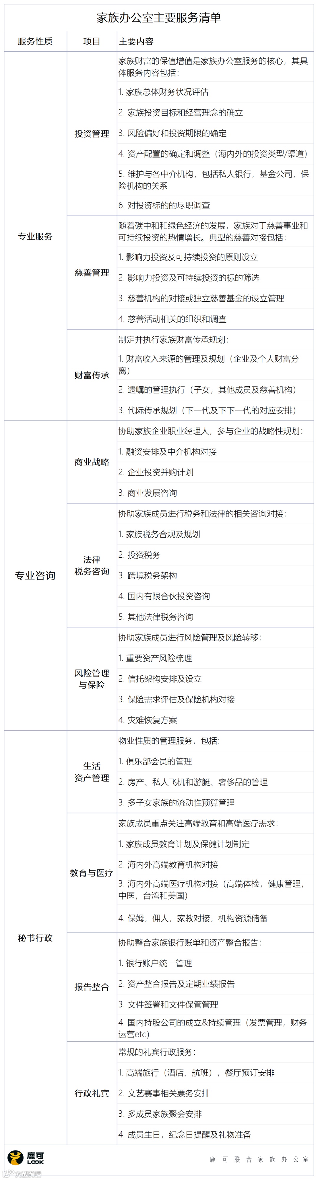 家族办公室 是一群专业人士的集合,为高净值人士及其家庭提供的服务非常广泛,类似与家庭大管家的角色,但其实比较重要的几项服务有全球资产配置、法律咨询、子女教育规划&家庭健康规划等。