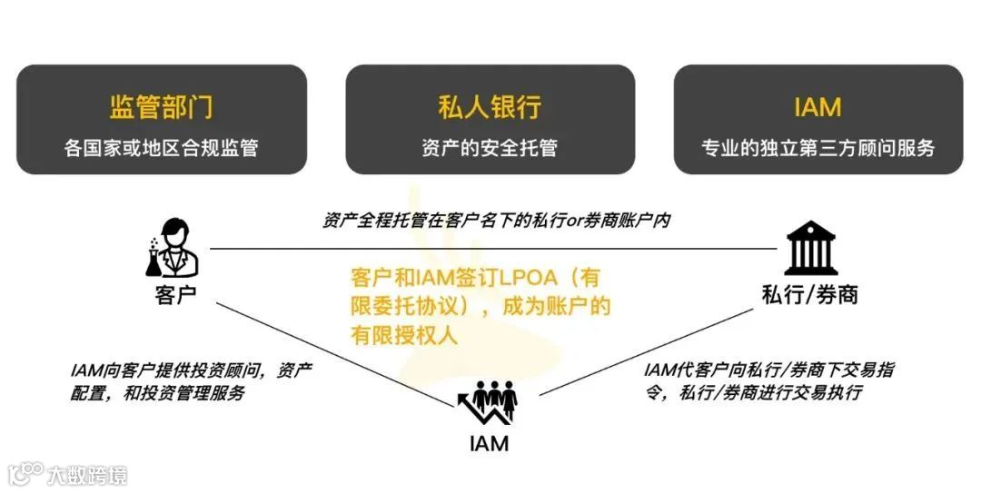 如上图所示,客户信任家办的专业能力,授权委托其为第三方,代表客户去配置资产;银行同家办签订IAM协议,认定该家办作为客户独立资产管理者身份的有效性。