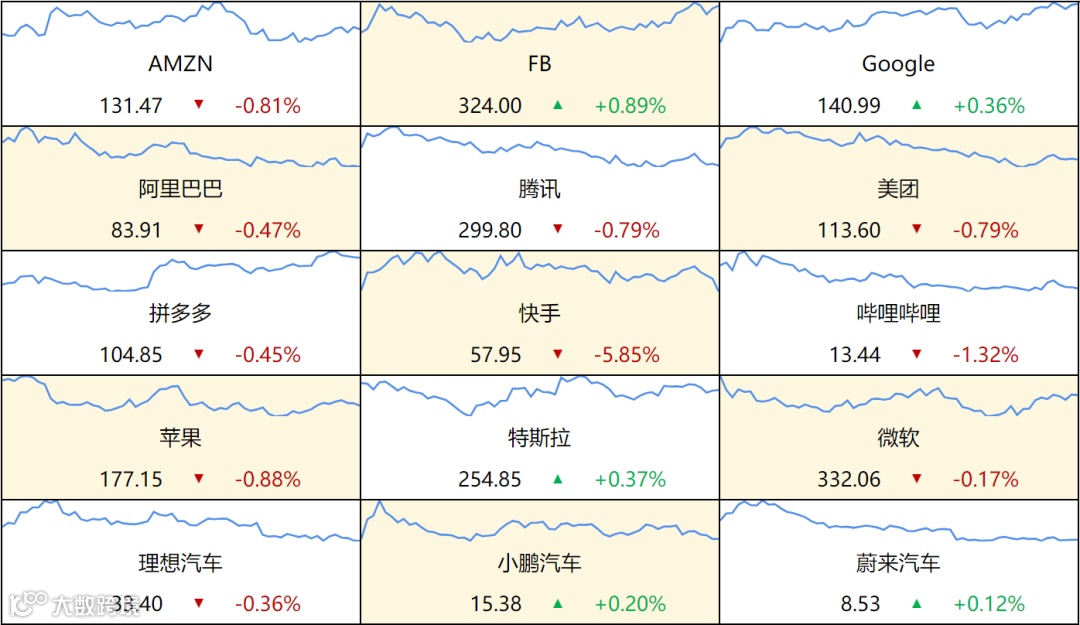 ▷ 美国股票:美国三大股指收盘涨跌不一,道指涨0.04%报33997.65点,标普500指数跌0.01%报4373.2点,纳指跌0.25%报13533.75点。雪佛龙涨1.34%,可口可乐涨1.2%,领涨道指。英伟达跌4.68%,特斯拉涨0.39%。中概股多数下跌,金生游乐跌6.77%,新濠博亚娱乐跌6.15%。