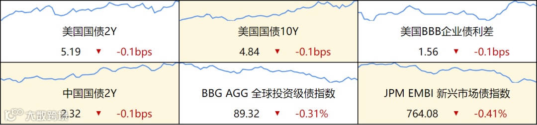 ▷ 发达国家债券:欧债收益率集体收涨,英国10年期国债收益率涨3.1个基点报4.508%,法国10年期国债收益率涨9.8个基点报3.500%,德国10年期国债收益率涨9.8个基点报2.879%,意大利10年期国债收益率涨12.5个基点报4.881%,西班牙10年期国债收益率涨9.8个基点报3.997%。