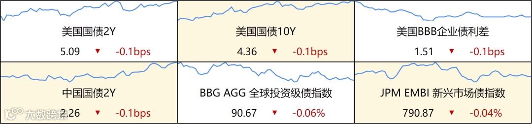 美债收益率集体收涨,2年期美债收益率涨3.9个基点报5.101%,3年期美债收益率涨5.1个基点报4.785%,5年期美债收益率涨6.1个基点报4.516%,10年期美债收益率涨5.8个基点报4.366%,30年期美债收益率涨4.2个基点报4.428%。