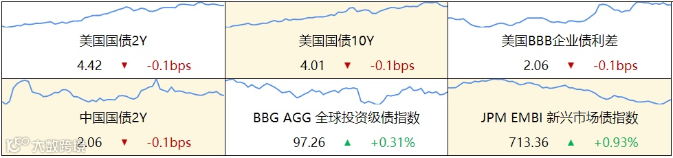 ▷ 美国债券:美债收益率普遍收跌,3年期美债收益率跌8.5个基点报4.384%,10年期美债收益率跌10个基点报4.011%,30年期美债收益率跌12.3个基点报4.143%。