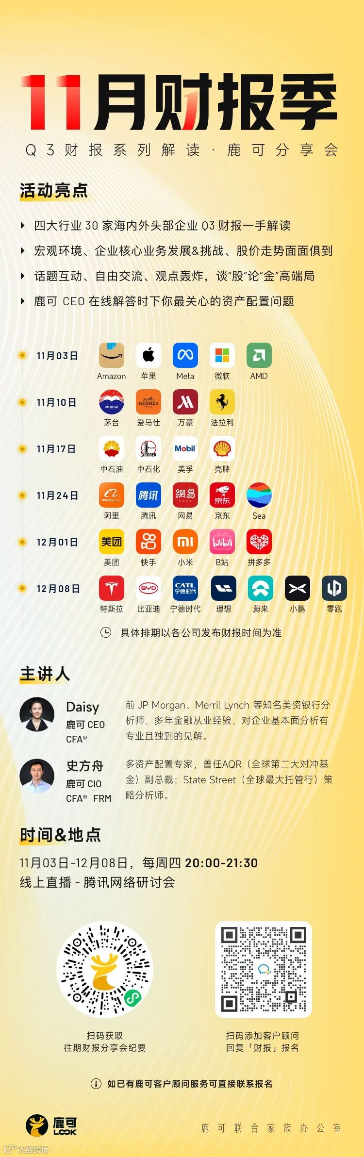 如果你还有更多关于中概个股业务解构、企业估值预测、美国加息周期、大类资产投资以及宏观经济趋势等方面的疑问,请扫描下方二维码,参加鹿可举办的Q3 财报季系列分享会,我们将从11月3日起连续举办六场、覆盖30家明星公司的财报解读活动,帮助高净值人士打开投资视野。