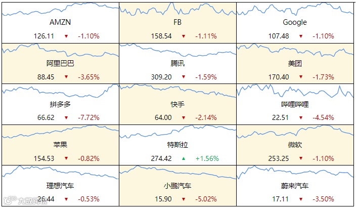 ▷ 美股:美国三大股指全线收跌,道指跌0.55%报31145.3点,标普500指数跌0.41%报3908.19点,纳指跌0.74%报11544.91点。3M公司跌4.12%,英特尔跌2.75%,领跌道指。万得美国TAMAMA科技指数跌0.67%,脸书跌1.11%,特斯拉涨1.56%。