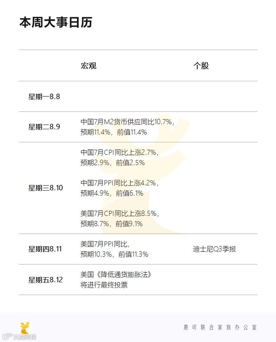 周初受Uber等财报提振,市场走高。但周五公布的非农就业数据远超预期,显示美国经济仍有弹性,可承受额外加息,市场转为预期9月加息75个基点(此前为50个基点)。由于投资者更关注即将公布的7月通胀数据,盘后美股仅小幅下跌。