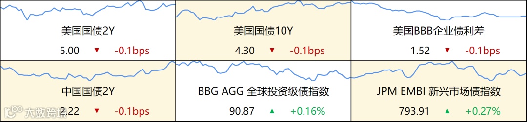▷ 美国债券:美国较长期公债收益率下跌,此前美联储多位官员的言论指向加息周期将暂停,但收益率仍录得周线上涨。10年期公债收益率下跌1个基点,报4.256%,周线上涨约9个基点,创约一个月以来最大周线涨幅。30年期公债收益率下跌2个基点,报4.332%。两年/10年期公债收益率差报负72.4个基点。两年期公债收益率上升2个基点,报4.978%。
