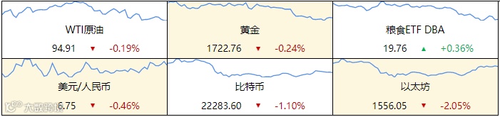 ▷ 商品:美国原油收在每桶95美元以下,为4月以来首次,之前欧盟表示,将允许俄罗斯国有公司向第三国付运石油。美国原油期货收跌1.65美元,或1.7%,收报每桶94.70美元。布兰特原油期货下跌0.66美元,或0.64%,收报每桶103.20美元。美国原油连续第三周收低。
