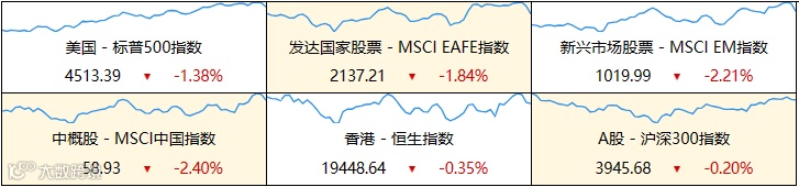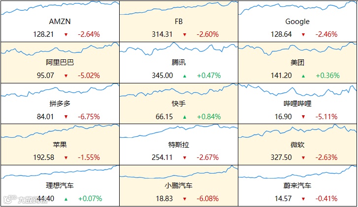 三大股指全线收跌,道指跌0.98%报35282.52点,标普500指数跌1.38%报4513.39点,纳指跌2.17%报13973.45点,中概股普遍下跌。