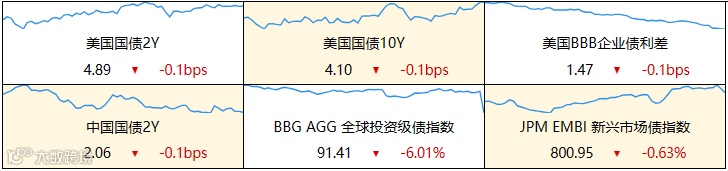 欧债收益率多数收跌,英国10年期国债收益率涨0.3个基点报4.394%。
