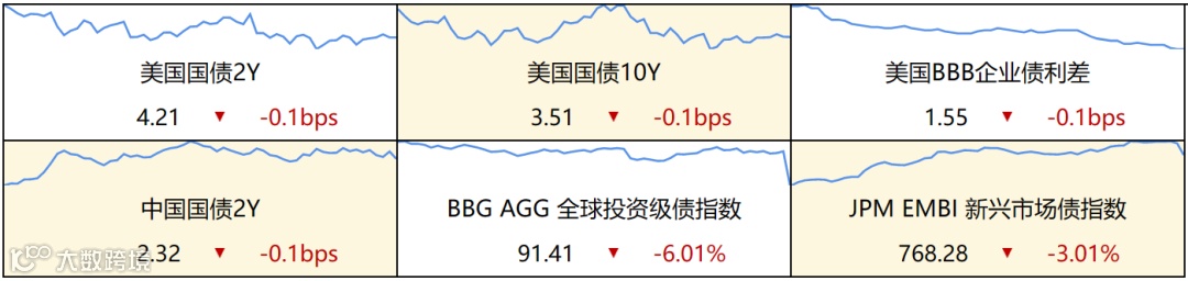 ▷ 发达国家债券:欧债收益率集体下跌,英国10年期国债收益率跌0.5个基点报3.327%,法国10年期国债收益率跌3.5个基点报2.746%,德国10年期国债收益率跌3.2个基点报2.280%,意大利10年期国债收益率跌4个基点报4.142%,西班牙10年期国债收益率跌4.1个基点报3.269%。