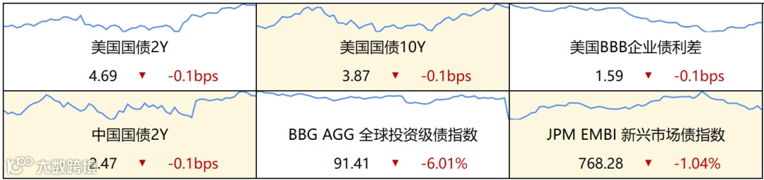 ▷ 发达国家债券:欧债收益率集体下跌,英国10年期国债收益率跌1.2个基点报3.583%,法国10年期国债收益率跌4.6个基点报2.949%,德国10年期国债收益率跌4.4个基点报2.473%。