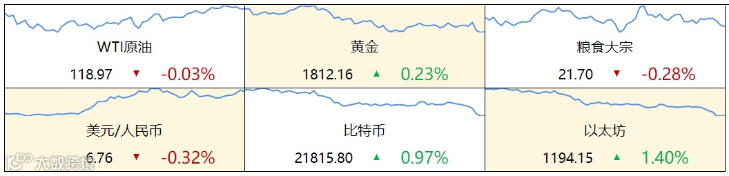 ▷ 商品:油价收低,人们担心美联储将以高于预期的幅度加息,让市场意外。布兰特原油期货结算价下跌0.9%,报每桶121.17美元。美国原油期货下跌0.7%,结算价报每桶118.93美元。