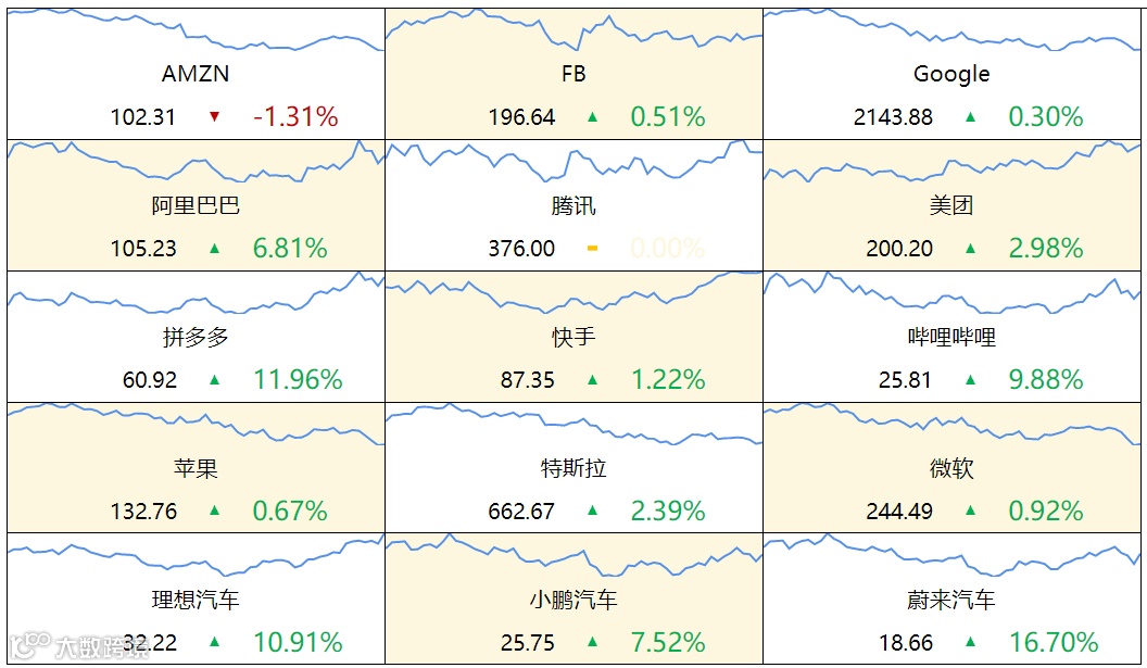 ▷ 中国股票:热门中概股多数大幅收涨,新东方涨超24%,爱奇艺涨近20%,蔚来涨超16%,拼多多涨近12%,理想汽车涨超10%,B站涨近10%,小鹏汽车涨超7%,阿里巴巴、百度、京东、36氪涨超6%。