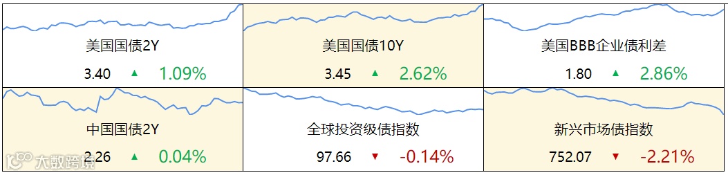 ▷ 发达国家债券:欧元区国债收益率创下多年新高,核心和二线国家国债利差扩大,人们担心央行加速收紧货币政策。被视为欧元区金融稳定性衡量指标的意大利/德国10年期国债收益率利差创下2020年4月以来最阔的252.9个基点。