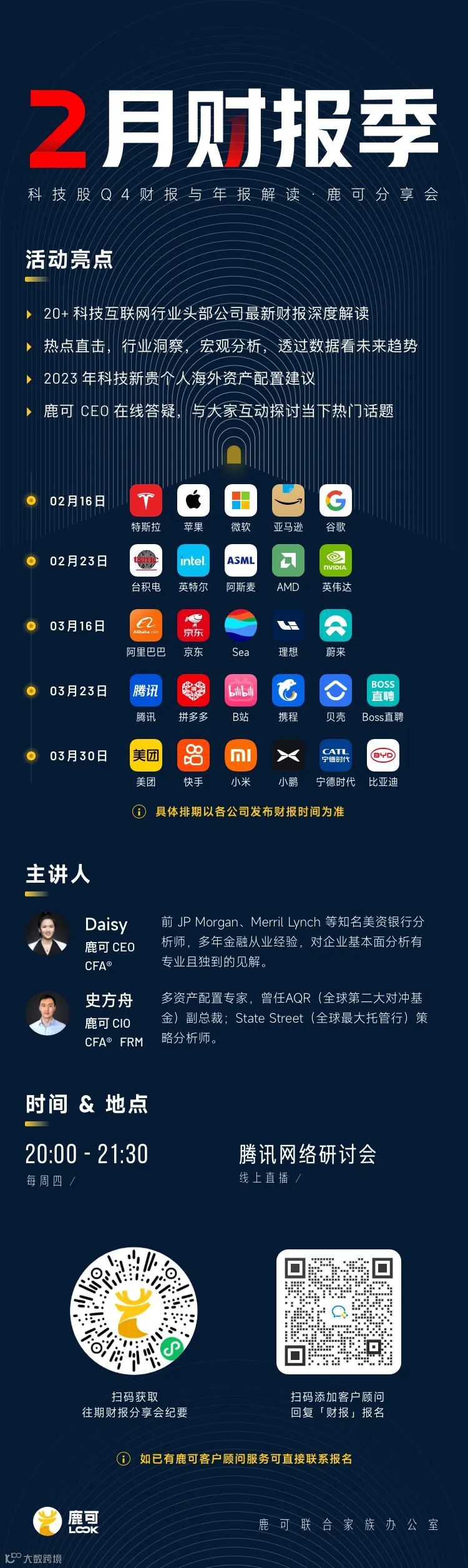 大类资产投资以及宏观经济趋势等方面的疑问,请扫描下方二维码,参加鹿可举办的Q4财报季系列分享会,我们将