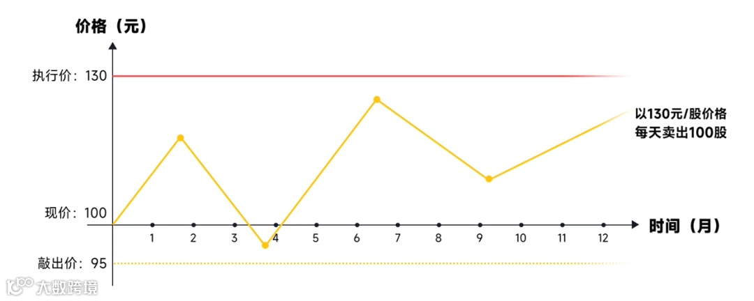 投资者买入一个DQ,其合约期限(Tenor)12个月,挂钩股票A(Underlying),保证期(Guaranteed period)1个月,杠杆倍数(Leveraged)为2,股票A初始价(Initial Price)100元,执行价(Strike Price)130元,敲出价(Knock-out Price)95元,每日卖出数量100股。