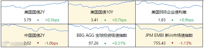 ▷ 发达国家债券:欧债收益率涨跌不一,英国10年期国债收益率跌3.9个基点报3.127%,法国10年期国债收益率跌0.9个基点报2.273%,德国10年期国债收益率跌1.3个基点报1.709%。