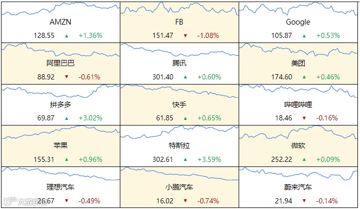 ▷ 美股:美国三大股指全线收涨,道指涨0.1%报31135.09点,标普500指数涨0.34%报3946.01点,纳指涨0.74%报11719.68点。雪佛龙涨2.42%,强生公司涨2.08%,领涨道指。特斯拉涨3.59%,亚马逊涨1.36%。中概股涨跌不一,尚乘数科涨306.5%。