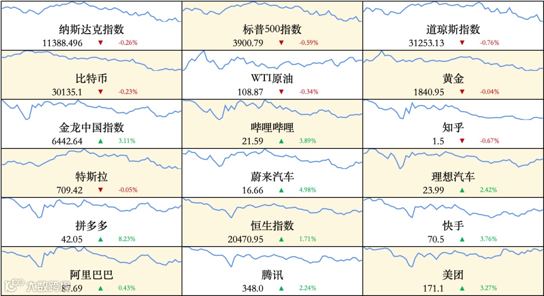 ▷ 美股:三大指数集体收跌,热门中概股大幅上涨:道指跌0.75%,纳指跌0.26%,标普500指数跌0.58%。美股大型科技股涨跌不一,苹果跌超2%,谷歌跌超1%,Meta跌0.49%,微软跌0.37%,特斯拉跌0.05%,亚马逊涨0.19%,Netflix涨超3%。中概股表现亮眼,好未来涨超13%,新东方涨超11%,拼多多涨约9%,爱奇艺、36氪涨超8%,B站涨超4%,京东、百度涨超5%。
