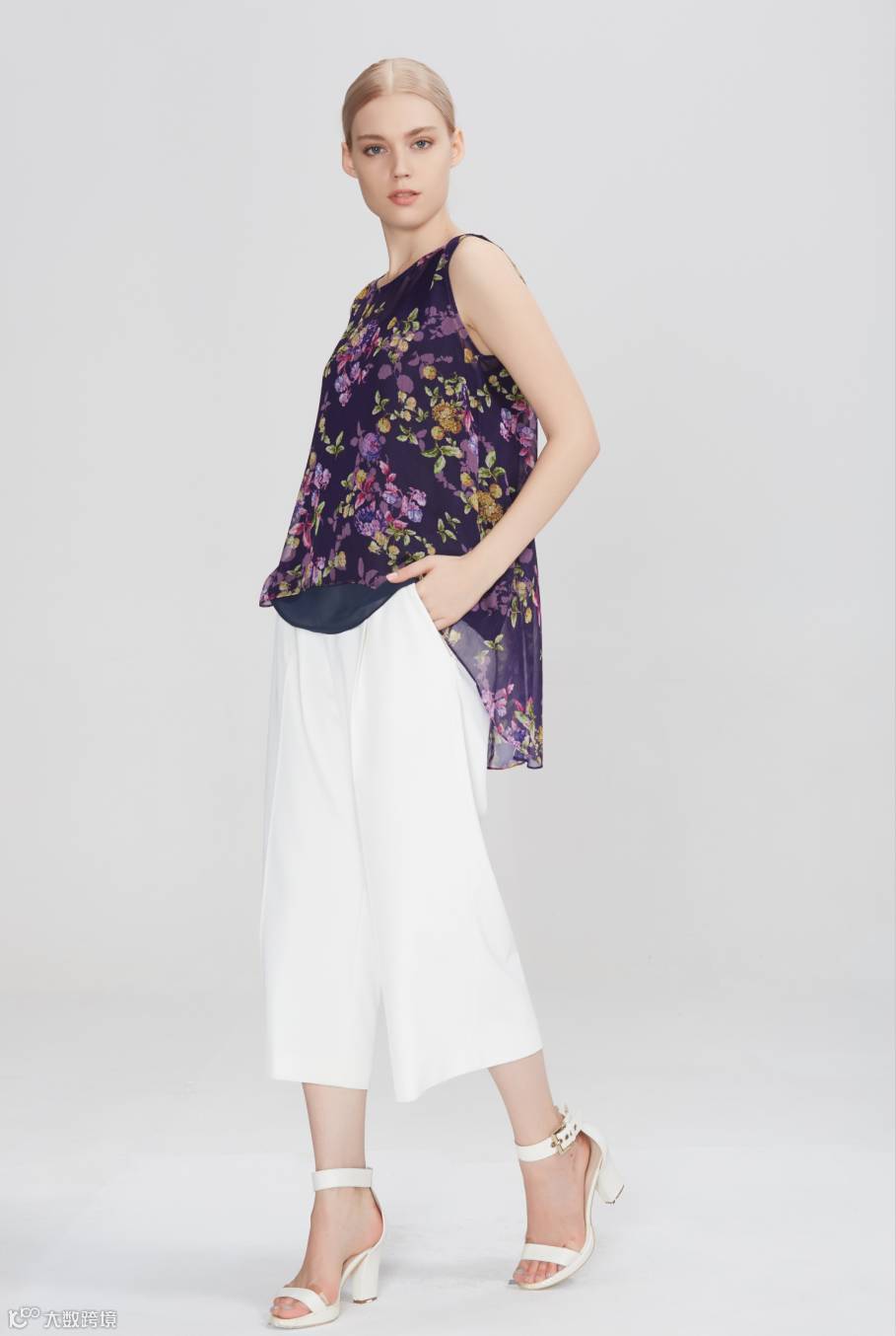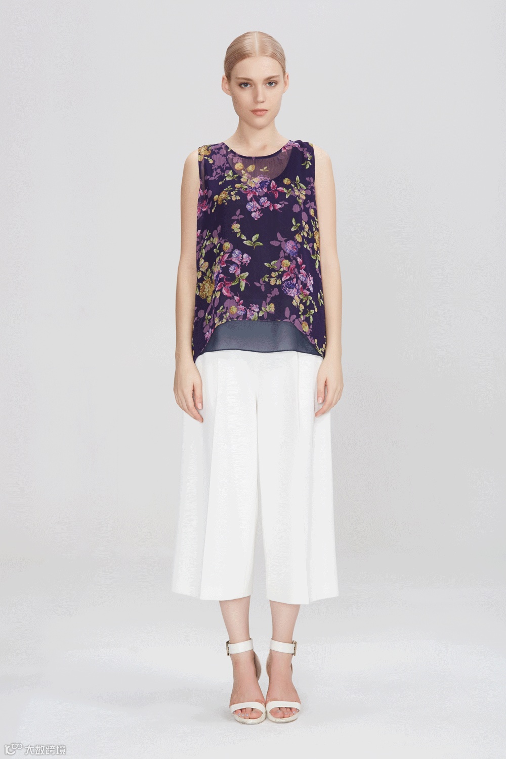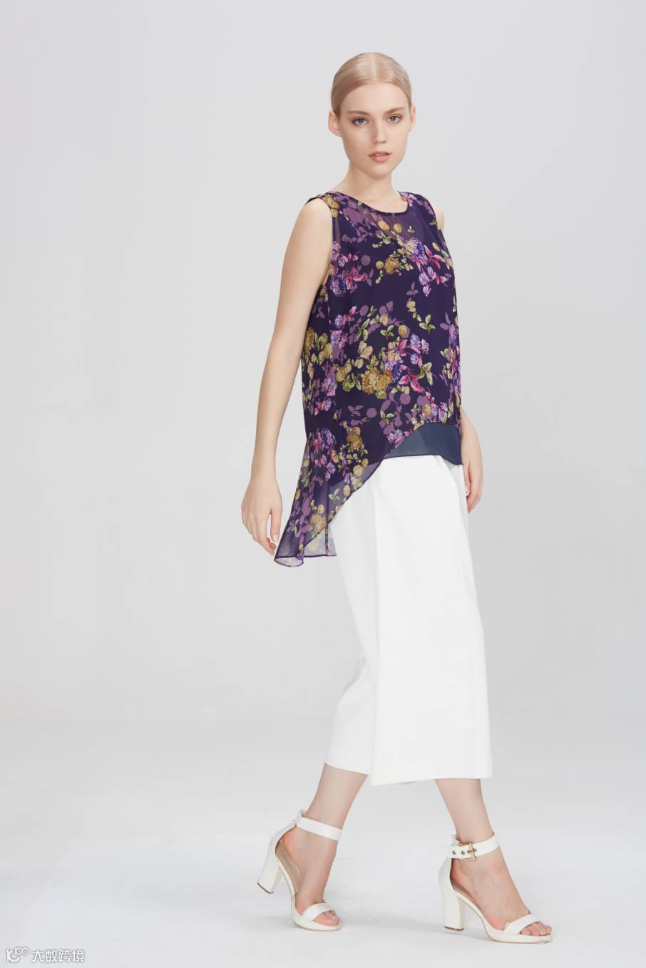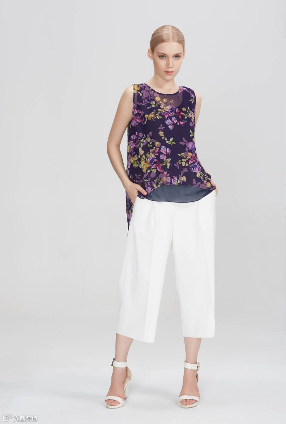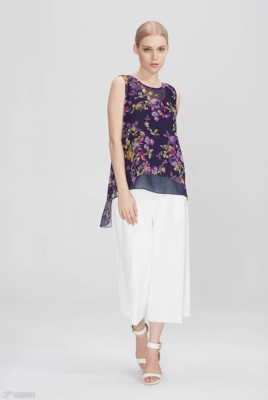 当枝桠爬满衣身,清风拂过,通身都散发着淡雅的香气,小衫前短后长的下摆增加了服装的灵动感。