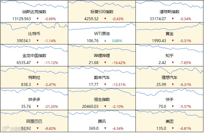 三大股指全线收跌,道指跌0.34%,标普500指数跌0.43%,纳指跌0.95%。