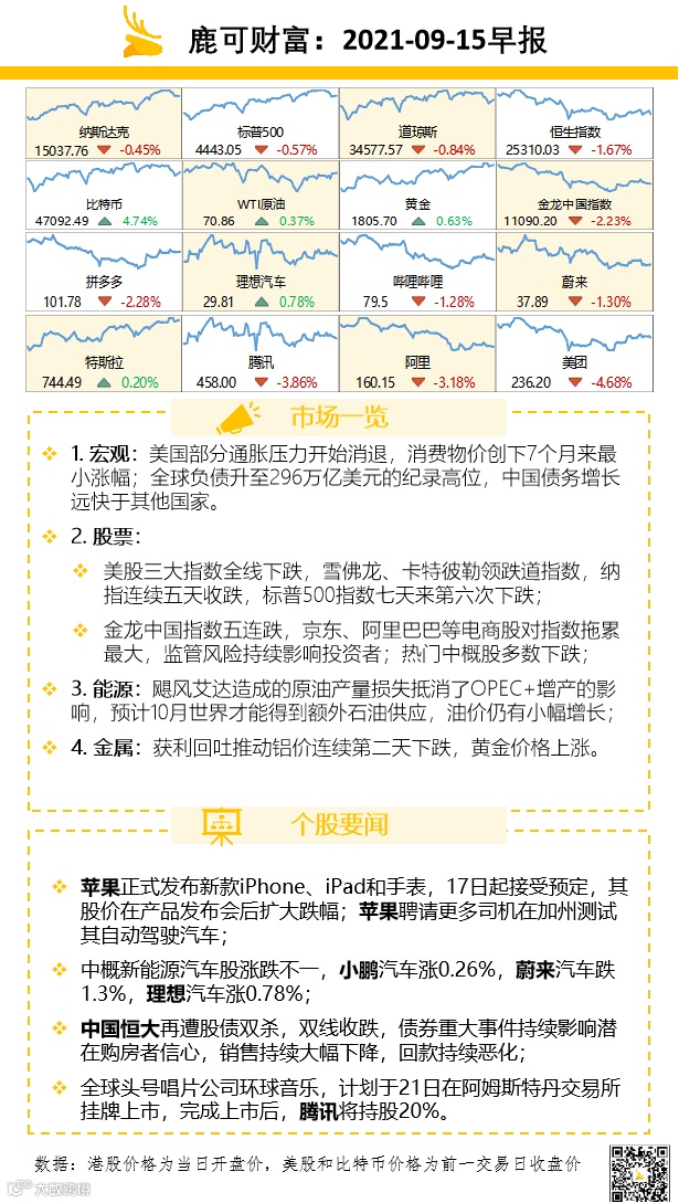 鹿可早报0915|苹果发布新款IPhone,美股三大指数全线下跌