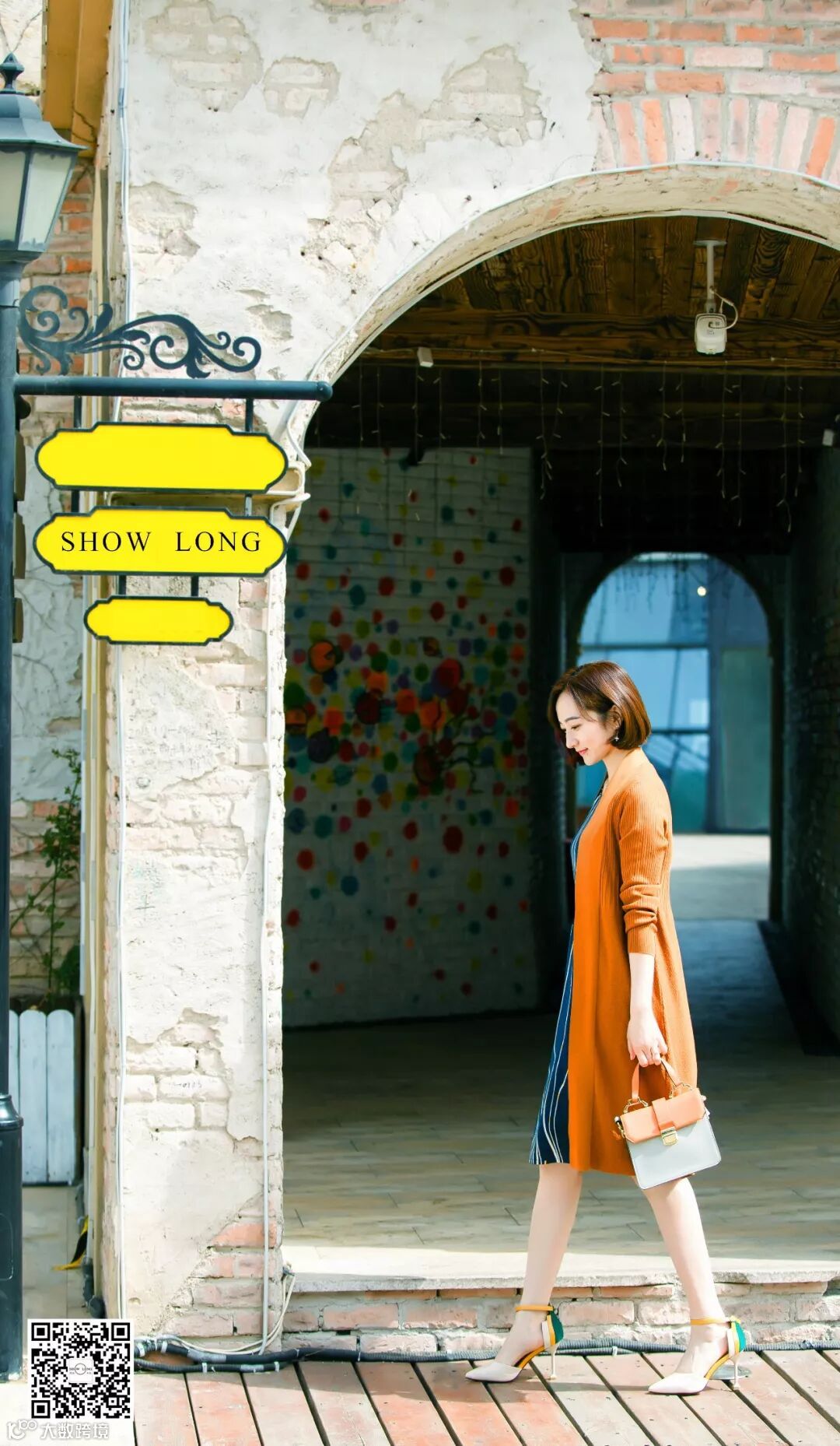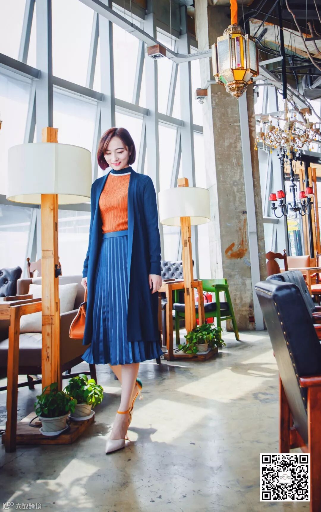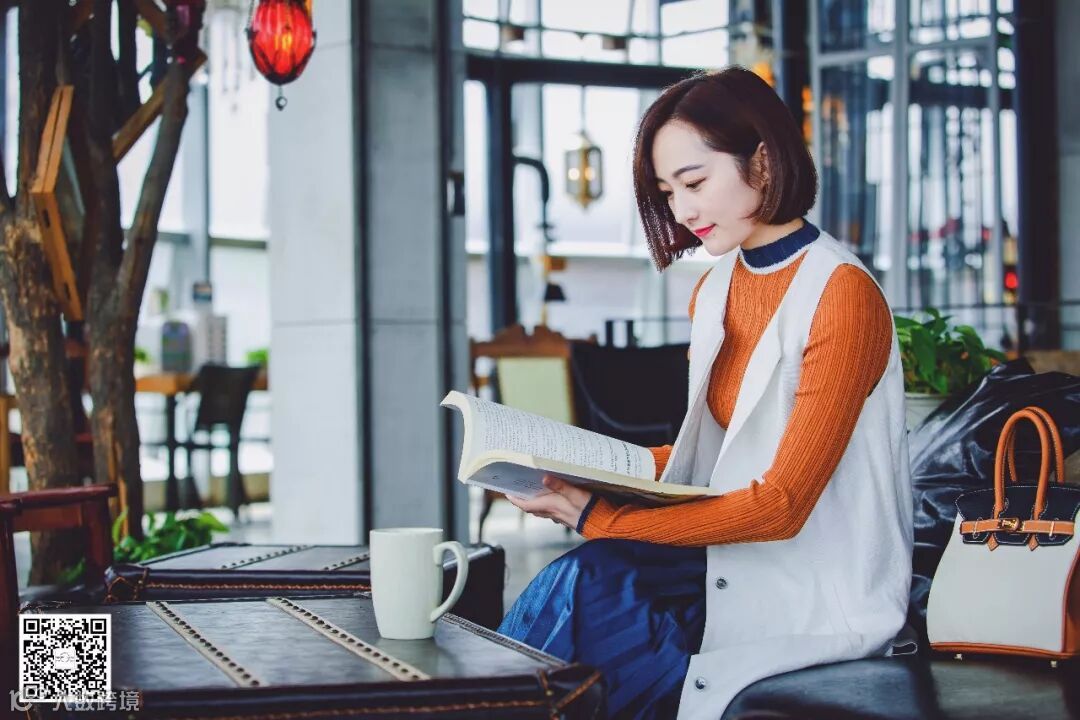 咖啡馆内,柔和的画面深入脑海,你穿着的白色马甲,柔橙色内搭和百褶裙,显得那么柔美和谐;
