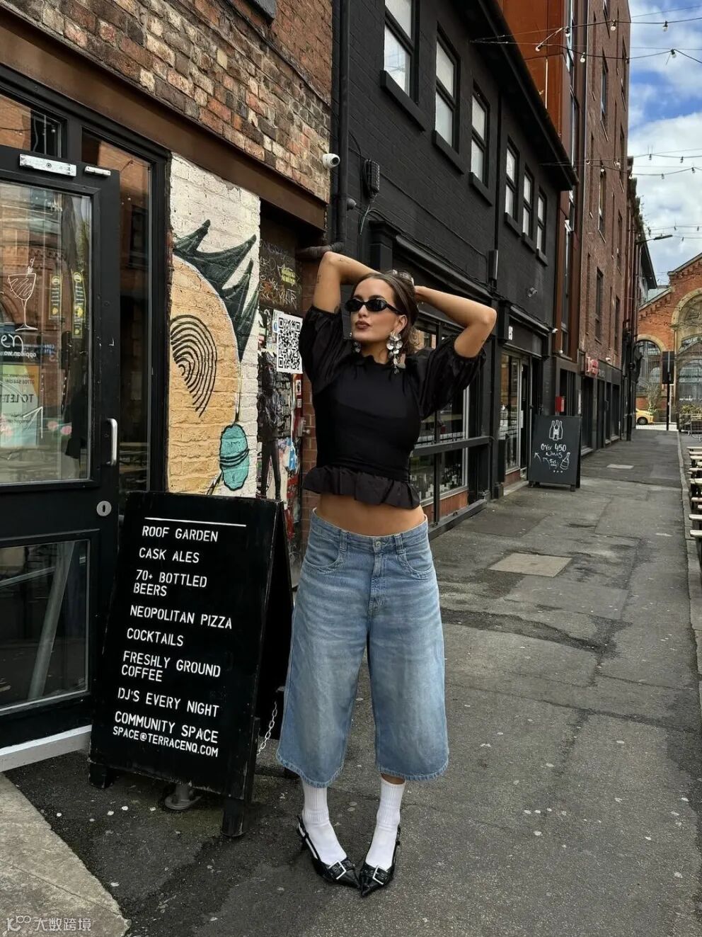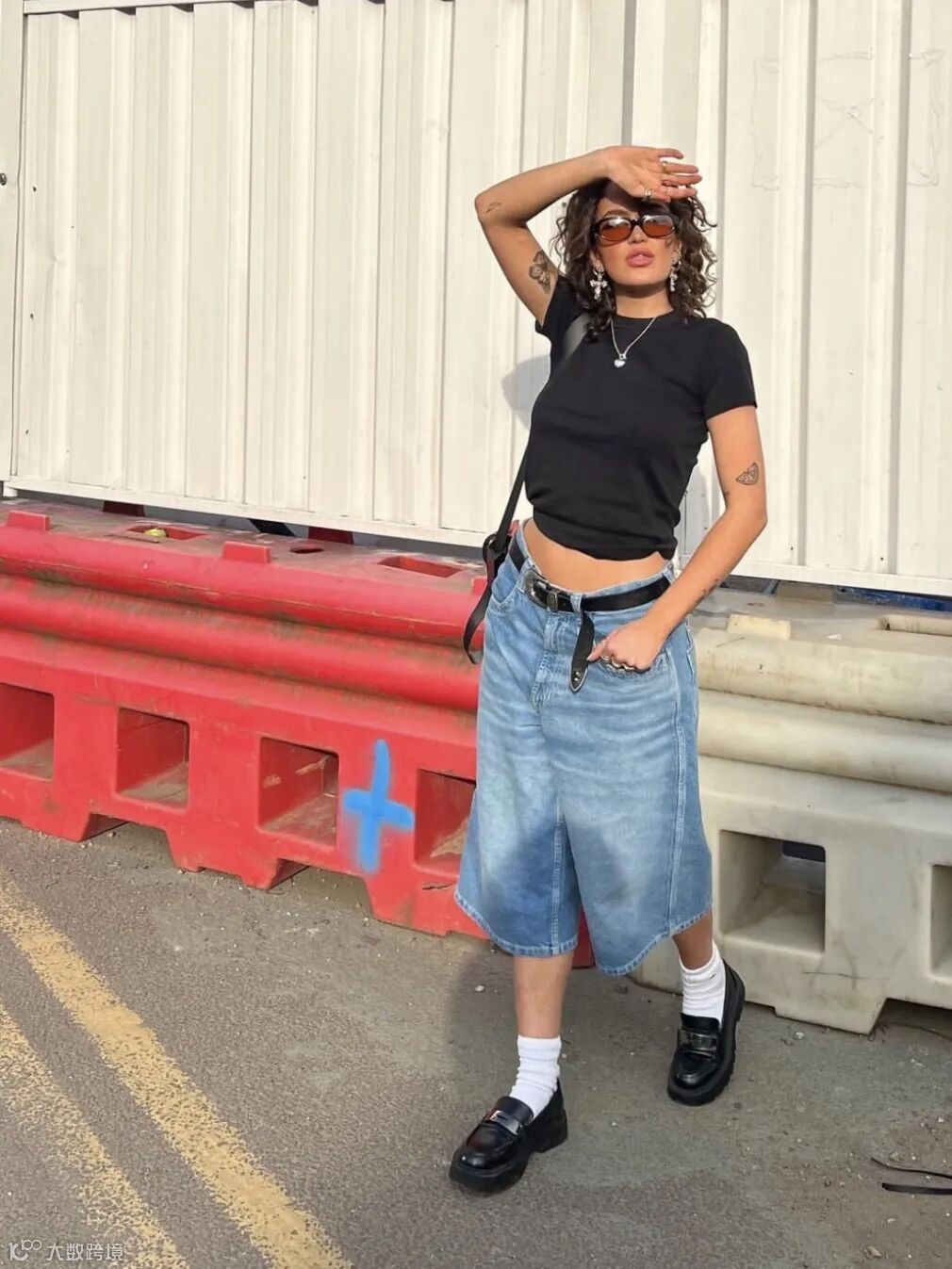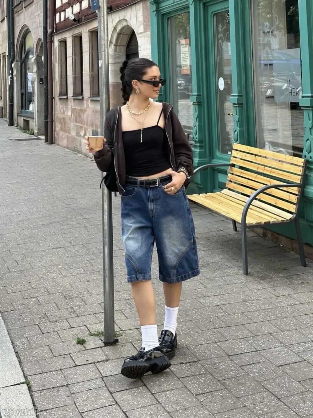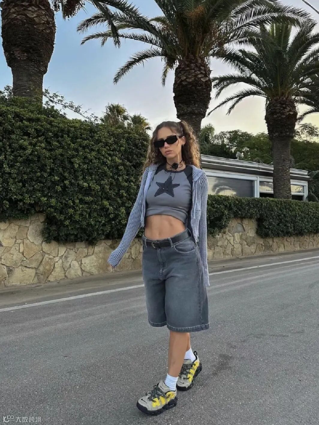 上衣可以尽量选择偏短加修身的版型,搭配Jorts一整个Y2K辣妹感。